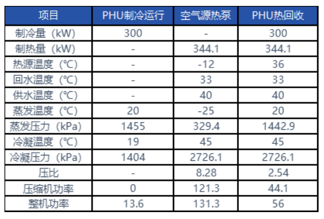 冬季采暖季節(jié), PHU熱回收機(jī)組可維持更高的蒸發(fā)溫度,利用小壓比壓縮機(jī),以極致的效率產(chǎn)出熱能,整機(jī)制熱能效比空氣源熱泵機(jī)組有顯著提升,從下面的對比表里可以一探端倪:
