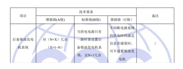 國標GB50174-2017《數(shù)據(jù)中心設計規(guī)范》中對于A、B、C三級數(shù)據(jù)中心后備柴油發(fā)電機系統(tǒng)的具體要求如下: