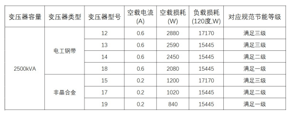 選擇高效的供電設備可以降低能耗并提高供電效率,如:干式變壓器改為非晶合金變壓器后,可降低變壓器總損耗30%。其對比傳統(tǒng)變壓器的節(jié)能效果如下: