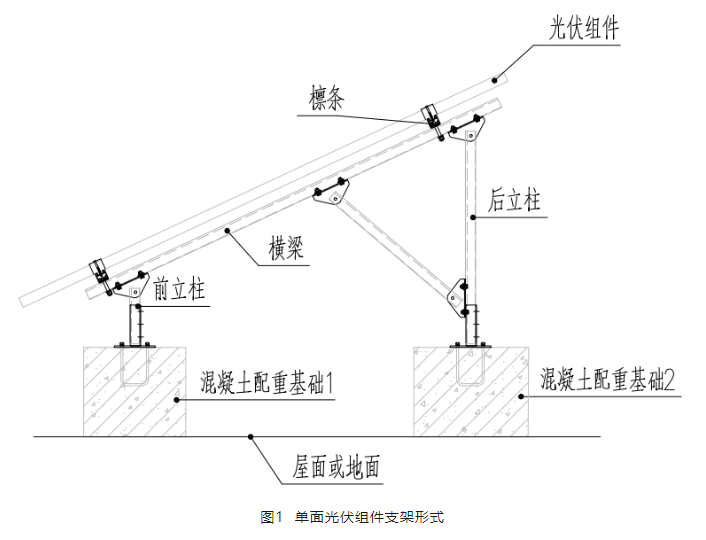 該支架體系由前后兩根立柱支撐一根橫梁,沿橫梁縱向搭設檁條,檁條之上通過壓塊將組件固定。該體系通過前后立柱的混凝土配重墩固定在屋面或者地面上。結構橫向由斜撐形成固定體系,縱向由混凝土基礎和檁條形成固定體系。經(jīng)眾多實際項目驗證,該結構體系能滿足光伏使用的結構安全需要。