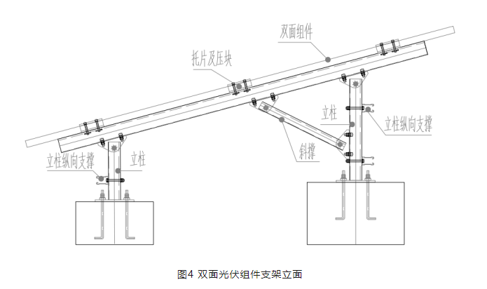 每塊光伏組件兩側(cè)均設置橫梁,組件通過壓塊和托片固定到橫梁上,橫梁通過前后立柱固定到基礎上。為了保證結構側(cè)向的穩(wěn)定,前立柱沿縱向設置一根縱向支撐,后立柱沿縱向設置兩根縱向支撐,雙面光伏組件支架立面如圖4所示。該支架結構體系取消縱向檁條,有效的避免了其對組件背面的遮擋。同時立柱設置的縱向支撐,提供了支架縱向的剛度,使支架在縱向形成穩(wěn)定的支架體系。具體安裝效果詳見第7節(jié)應用案例。