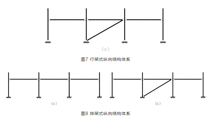 支架縱向結構體系根據(jù)立柱與基礎的連接形式不同,同樣分為兩種結構體系,柱底鉸接和柱底固結的形式。柱底鉸接形式為行架式縱向結構體系,見圖7。柱底固結為排架式縱向結構體系,見圖8。