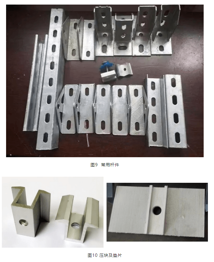 圖10為光伏常用壓塊和墊片,壓塊與墊片采用螺栓擰緊,中間夾光伏組件實現(xiàn)固定。