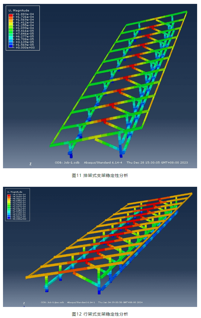 需要指出,排架式支架比行架式支架結構約束更多,超靜定次數(shù)更高,因此結構位移小,穩(wěn)定性好。從結構穩(wěn)定性角度,本文推薦采用排架式支架結構體系。