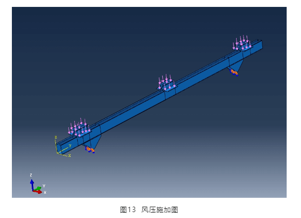 為驗證壓塊與橫梁節(jié)點部位的受力,取一根橫梁采用三維應力單元進行仿真分析。風荷載施加到壓塊上,通過壓塊傳遞給橫梁,三角連接件底部設置固定支座,見圖13,橫梁通過三角支座固定。