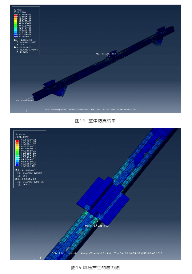 設計規(guī)范要求,支架采用的螺栓均固定擰緊。因此,各部分可視為緊密結合,不產(chǎn)生滑移,采用共單元節(jié)點進行仿真分析。通過圖14及圖15可以看出,風壓產(chǎn)生的最大應力在橫梁上,為160.2MPA,小于鋼材強度設計值215MPA。