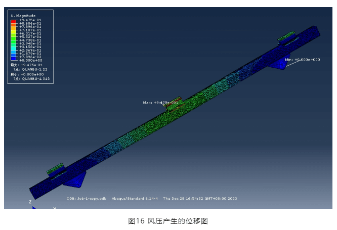 從圖16可以看出,風壓產(chǎn)生的最大位移為0.95mm(特別指出該位移與圖11、12所示位移不同,是因為荷載施加方式不同,圖11及圖12僅為驗證結構體系整體穩(wěn)定性,因此荷載采取沿橫梁施加線荷載的方式),橫梁截面無翹曲,因此,該創(chuàng)新壓塊節(jié)點滿足強度要求。