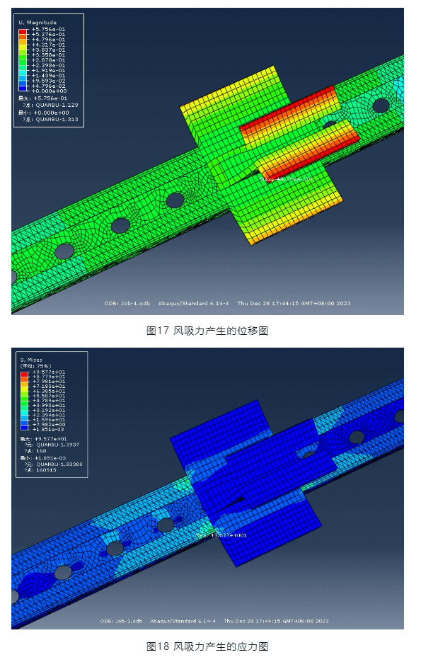 圖17及圖18為風吸力作用下,節(jié)點與橫梁的位移和應力圖。最大位移發(fā)生在壓塊上,為0.58mm,最大應力發(fā)生在橫梁上為96MPA,同樣小于鋼材強度設計值215MPA。因此,風吸力作用下,節(jié)點和橫梁同樣滿足強度要求。