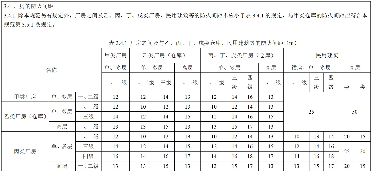 多棟數(shù)據(jù)中心的防火措施主要是加大建筑物之間的間距。防火間距主要是指防止著火建筑在一定時間內(nèi)引燃相鄰建筑。規(guī)范規(guī)定的防火間距如下圖所示: