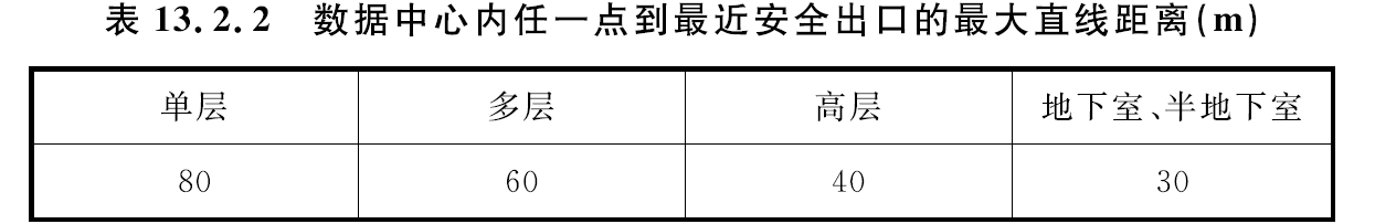 當數(shù)據(jù)中心按照廠房進行設(shè)計時,數(shù)據(jù)中心的火災(zāi)危險性分類應(yīng)為丙類,數(shù)據(jù)中心內(nèi)任一點到最近安全出口的直線距離不應(yīng)大于表 13.2.2的規(guī)定。當主機房設(shè)有高靈敏度的吸氣式煙霧探測火災(zāi)報警系統(tǒng)時,主機房內(nèi)任一點到最近安全出口的直線距離可增加50%。