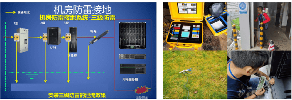 防雷保護:數(shù)據(jù)中心應(yīng)采取多級防雷保護措施,包括電源系統(tǒng)和信號線路的防雷保護。各形成完整的防雷系統(tǒng)。對于重要設(shè)備和線路,應(yīng)采取更加嚴級防雷設(shè)備之間應(yīng)相互配合格的防雷措施,如加裝浪涌保護器等。