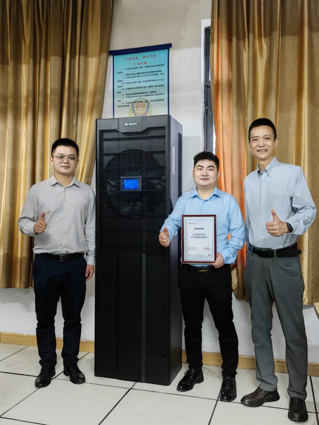 HEX精密空調已在全國范圍批量交付,海悟合作伙伴業(yè)務及分銷渠道總監(jiān)戴勇赴長沙客戶現場,與海悟湖南代表處一起為分銷合作伙伴湖南銀博信息科技發(fā)展有限公司頒發(fā)了“HEX精密空調交付榮耀時刻紀念”證書。
