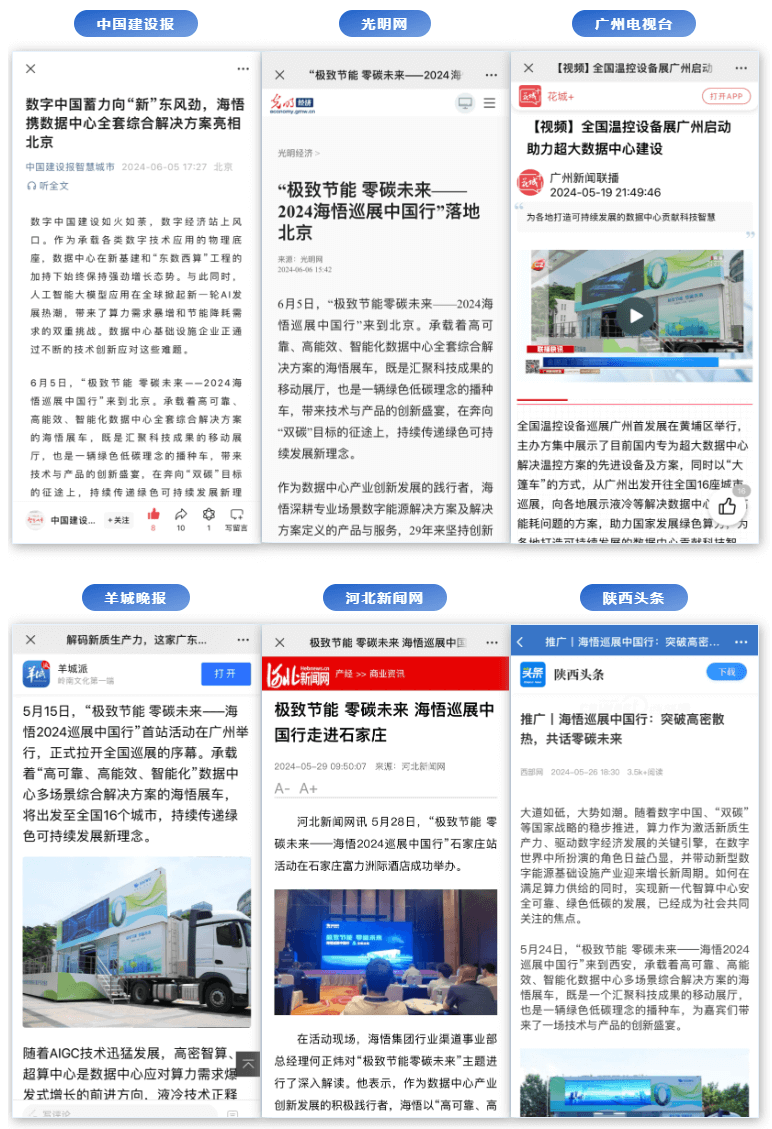 “2024海悟巡展中國行”攜先進數據中心綠色解決方案一路前行的同時,還受到了廣泛的社會關注。截至目前,海悟巡展中國行已獲中國建設報、光明網、廣州電視臺、廣州經視頻道、羊城晚報、廣州日報、東莞日報、佛山PLUS、河北新聞網、西部網、陜西頭條、中國高新網等多家主流媒體的聚焦報道,海悟的品牌實力、專業(yè)口碑、社會影響力顯著提升。