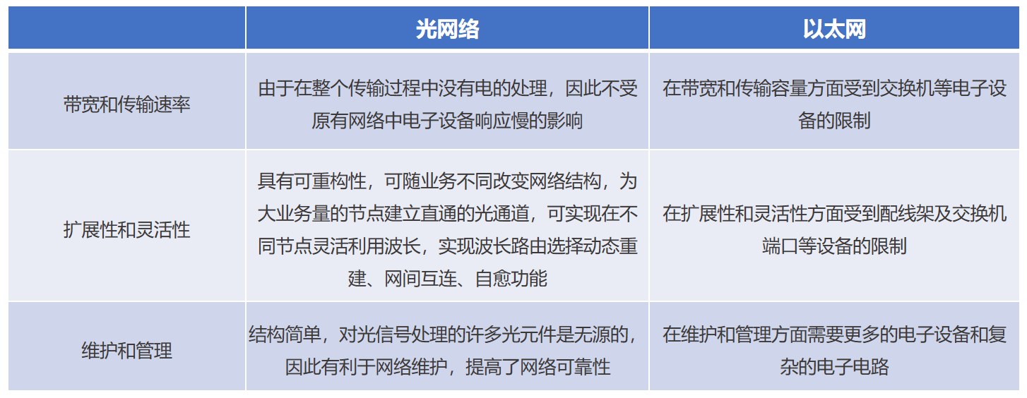 MPO/MTP預(yù)連接系統(tǒng)適用于高密度的機柜,采用模塊化設(shè)計,便于日后的擴展和維護,對于大規(guī)模光纖連接項目,使用MPO/MTP預(yù)連接系統(tǒng)可顯著節(jié)約成本。并且可以借助3D可視化平臺,實現(xiàn)跳線、鏈路的查詢和顯示,提高系統(tǒng)可靠性和維護效率,降低運維管理成本。隨著AI、大數(shù)據(jù)及云計算的蓬勃發(fā)展,網(wǎng)絡(luò)帶寬傳輸速率的要求不斷提高,光網(wǎng)絡(luò)將逐漸成為主流,而光網(wǎng)絡(luò)對比目前的以太網(wǎng)有以下幾點優(yōu)勢: