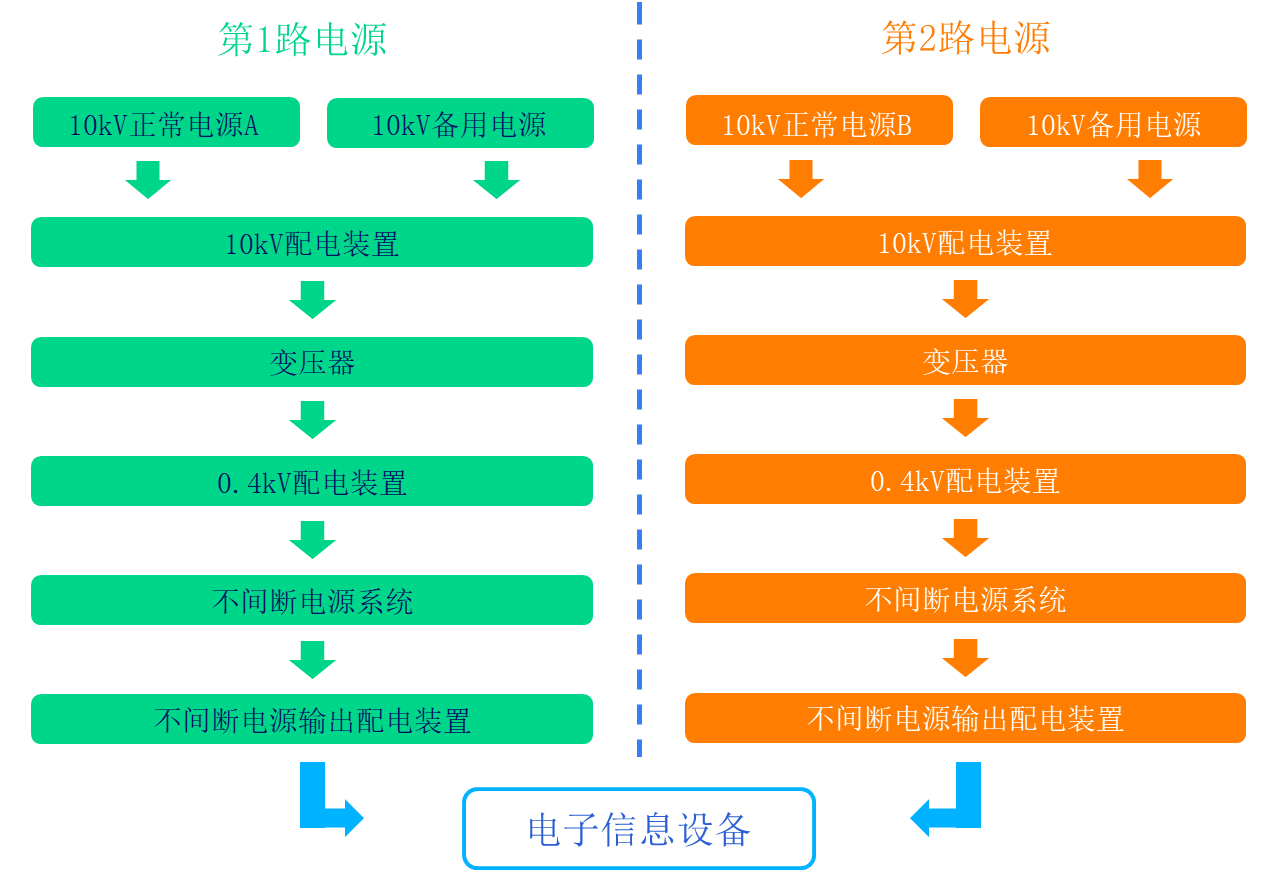 A級數(shù)據(jù)中心由雙路電源供電,并設置備用電源。正常運行時,數(shù)據(jù)中心由雙路電源供電,每路電源承擔50%的負荷;當一路電源出現(xiàn)故障,另一路電源承擔全部負荷;當兩路電源都出現(xiàn)故障,備用電源投入運行,承擔全部負荷的需要。