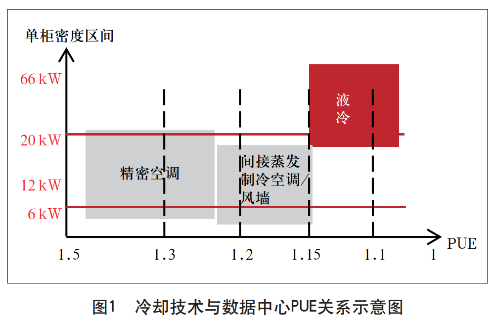 伴隨云計算、大數(shù)據(jù)、人工智能等技術(shù)的發(fā)展和應(yīng)用,作為信息基礎(chǔ)設(shè)施的數(shù)據(jù)中心及相關(guān)設(shè)備承擔(dān)的計算量越來越大,數(shù)據(jù)中心服務(wù)器及通信設(shè)備自身處理能力和集成度不斷提高,同時也帶來了功率密度節(jié)節(jié)攀升的問題,高熱密度給制冷設(shè)備和技術(shù)提出了更高要求。受限于物理空間以及空氣比熱容低的特性,風(fēng)冷技術(shù)難以滿足高功率元器件散熱負(fù)荷需求,如圖1所示。