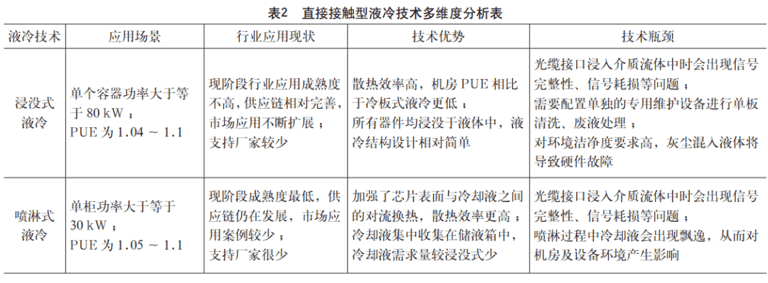 針對浸沒式液冷技術(shù)和噴淋式液冷技術(shù),分別從應(yīng)用場景、行業(yè)應(yīng)用現(xiàn)狀及技術(shù)本身的優(yōu)劣勢進行多維度分析,具體分析結(jié)果見表 2。