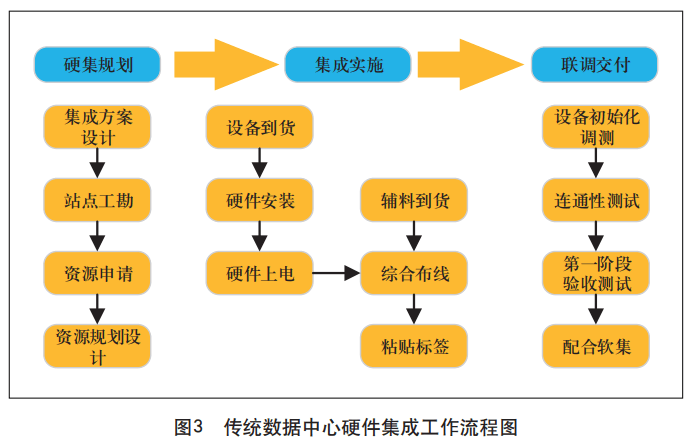 傳統(tǒng)數(shù)據(jù)中心硬件系統(tǒng)集成主要完成工程項目中硬件層多廠家、多類型設(shè)備的硬集方案規(guī)劃、集成實施和聯(lián)調(diào)交付等工作, 是工程設(shè)計的延伸和落地,為軟件系統(tǒng)集成 入場實施提供必要的硬件系統(tǒng)環(huán)境。傳統(tǒng)數(shù)據(jù)中心硬件系統(tǒng)集成工作流程如圖3所示。