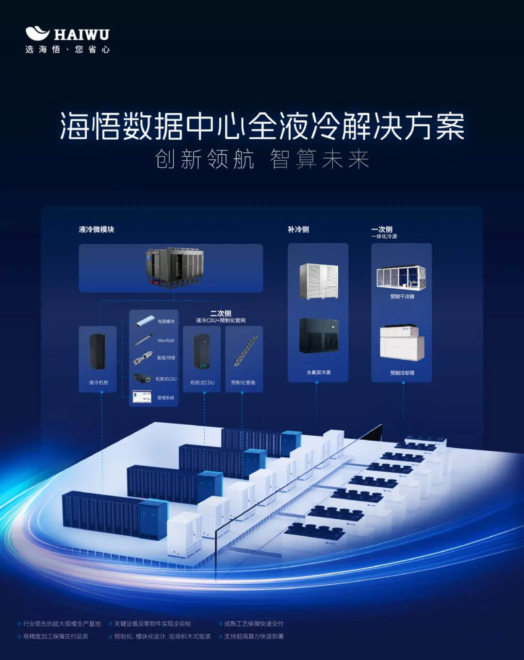 面對算力變革及機(jī)房實(shí)際運(yùn)營需求,海悟針對超算、智算等高密場景,通過模塊化、預(yù)制化等關(guān)鍵技術(shù)打造極簡交付、極致節(jié)能、極致節(jié)水、穩(wěn)定可靠、智能運(yùn)維的高密近場風(fēng)墻、冷板式液冷、浸沒式液冷等全場景解決方案產(chǎn)品。