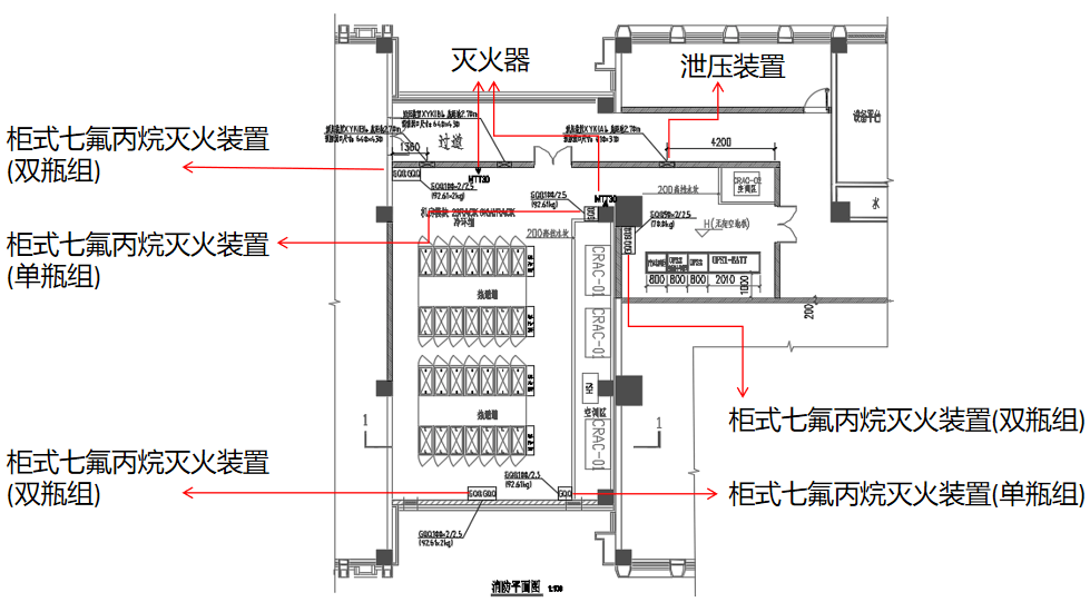 3)柜式七氟丙烷氣體滅火裝置可按保護半徑不大于7.5m布置。可將總需要柜數(shù)按保護距離均布。