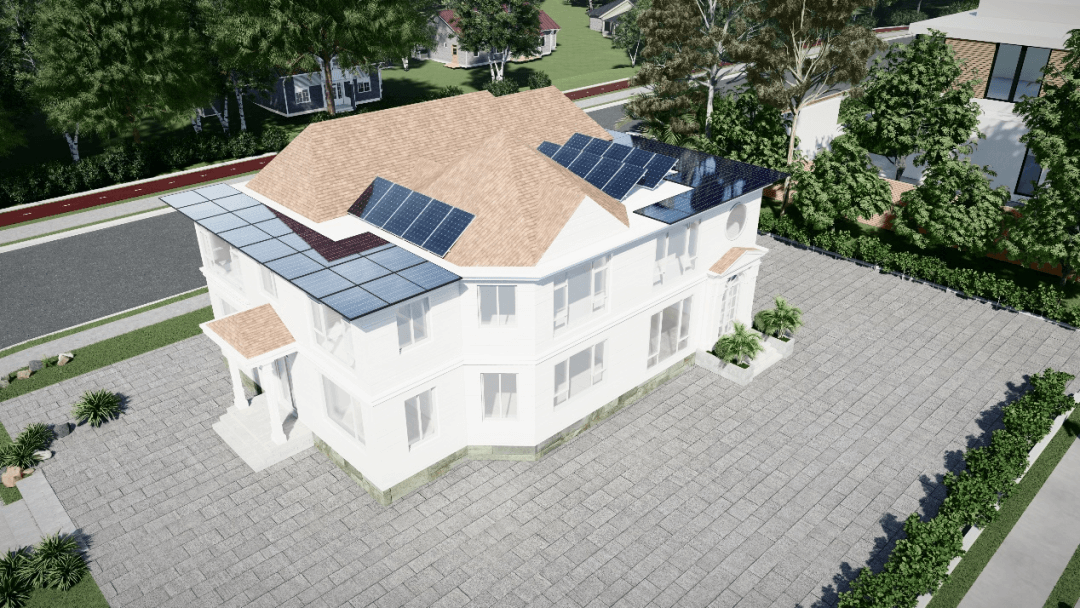 原有住宅建筑屋頂系統(tǒng)為采用深色大波紋瓦覆蓋的多面坡結(jié)構(gòu),歐式風格突出,不宜粗魯?shù)卮蚱啤D媳眰?cè)外擴部分,為實現(xiàn)發(fā)電、產(chǎn)熱的功能而采用平鋪方式,雖不盡完美,但對整棟住宅的觀瞻影響相對較小,方案在可接受范圍。