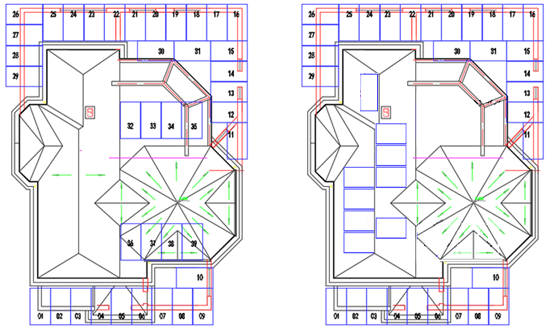 原有屋面系統(tǒng)上2處坡度安裝的PVT組件,則過于突兀,對建筑外觀破壞過大;且位于小平臺上的4塊PVT組件采光條件復(fù)雜,在系統(tǒng)中又與南向坡面的4塊PVT組件同處一個組串,相互干擾,影響系統(tǒng)效率。因此,重新考慮將其布置于東向和西向坡屋面上,如下圖b,雖然也對建筑觀瞻有一定負面影響,但隨著近些年公眾對屋面光伏系統(tǒng)的接受度越來越高,屋面上整齊敷貼布設(shè)的光伏板已經(jīng)成為業(yè)主前衛(wèi)新潮、崇尚環(huán)保的新標簽。屋頂小平臺建議恢復(fù)為屋頂花園景觀,提升整個建筑的靈動感。