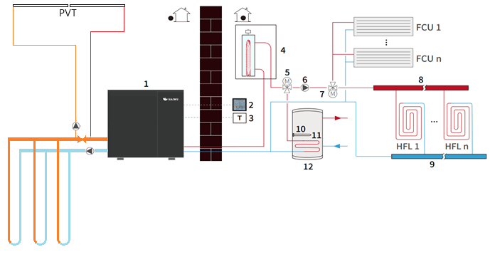 方案一:安裝一臺滿足冷負荷64.22kW的空氣源熱泵。此方案為典型的冷暖熱水3聯(lián)供系統(tǒng),常見系統(tǒng)如下圖。空氣源熱泵夏季用于空調(diào)制冷、冬季用于供暖、熱水在供暖季采用熱泵切換加熱、在非采暖季采用電加熱管加熱。如果設(shè)想夏季利用PVT的熱量加熱水箱,鑒于熱水的需熱量過小,系統(tǒng)的復(fù)雜程度不宜過高,不予采納。又由于空氣源熱泵與pvt熱量耦合利用的季節(jié)性矛盾,本項目不適用此方案。