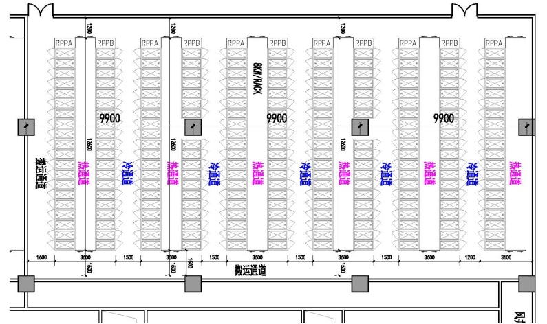 8kW/架機(jī)房根據(jù)冷通道最小寬度1.5米,柱網(wǎng)可為9.9米