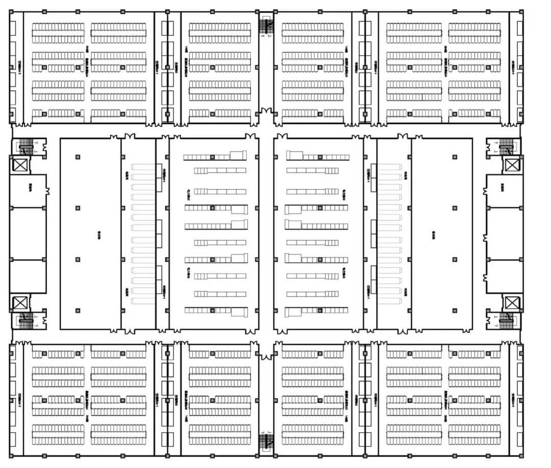 數(shù)據(jù)中心建筑內(nèi)包括數(shù)據(jù)機(jī)房、電力室、電池室、空調(diào)設(shè)備用房、柴油發(fā)電機(jī)房等組成部分,設(shè)計(jì)時(shí)充分考慮電力、空調(diào)制冷量、機(jī)柜數(shù)量和機(jī)柜總功率等因素,盡量做到電力資源利用最大化,同時(shí)降低PUE、WUE等指標(biāo)。因此數(shù)據(jù)中心設(shè)計(jì)通常采用模塊化布局,按照變壓器和UPS容量推導(dǎo)機(jī)架總功耗、機(jī)架數(shù)量、空調(diào)設(shè)備配置, 從而形成一個(gè)標(biāo)準(zhǔn)的機(jī)房模塊,模塊之間進(jìn)行組合形成一個(gè)機(jī)房單元,機(jī)房單元通過(guò)交通空間鏈接和配套用房輔助就形成了完整的建筑平面。