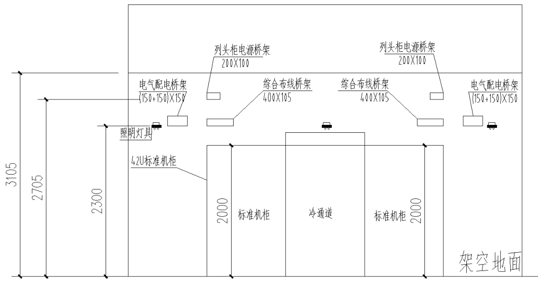 IT機(jī)房模塊間機(jī)柜高度為2000~2200mm,上部設(shè)置綜合布線和列頭柜出線橋架,強(qiáng)弱電間距300mm,凈高需求約3105~3400mm。