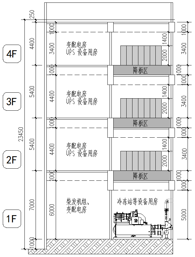 非降板區(qū)域:合計(jì)層高6800~7000mm+結(jié)構(gòu)梁(板)1000mm=設(shè)備房?jī)舾?800~6000mm。該區(qū)域可設(shè)置對(duì)凈高要求最大的柴發(fā)機(jī)組等設(shè)備用房。