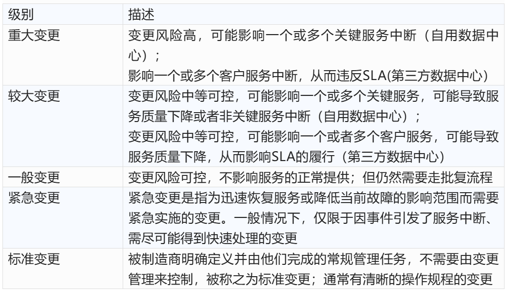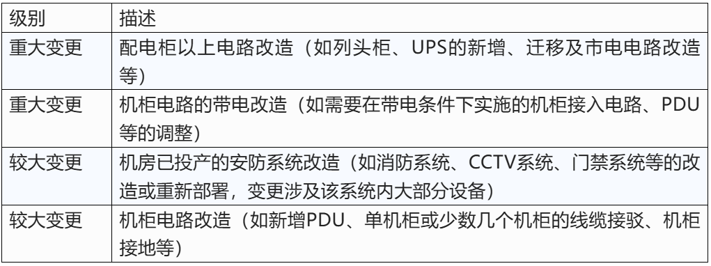 (1)數(shù)據(jù)中心變更的定級。根據(jù)變更風(fēng)險,的高低,數(shù)據(jù)中心的典型變更級別分為重大變更、較大變更、一般變更及標(biāo)準(zhǔn)變更四個級別。變更定級方法見下表。用戶可以根據(jù)自己的情況進(jìn)行變更的定級劃分,在實際變更定級中,沒有統(tǒng)一的強(qiáng)制標(biāo)準(zhǔn),而是由具體的業(yè)務(wù)和管理要求決定。