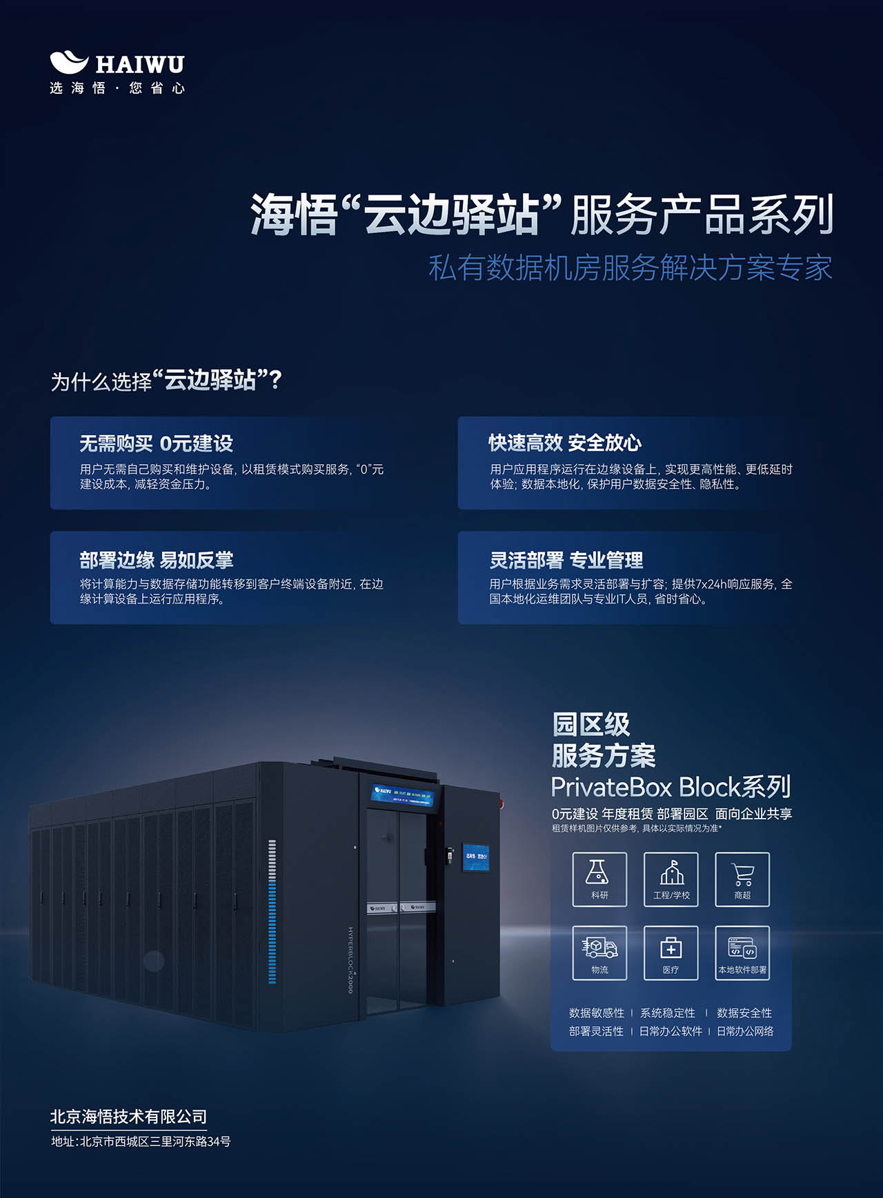 “云邊驛站”是海悟云面向企業(yè)園區(qū)、寫字樓等場景推出的私有數(shù)據(jù)機房托管服務(wù)方案。它通過在客戶園區(qū)內(nèi)建立近端私有云基礎(chǔ)設(shè)施,為企業(yè)提供機柜、UPS配電、服務(wù)器等核心資源,打造專屬的私有云數(shù)據(jù)底座。