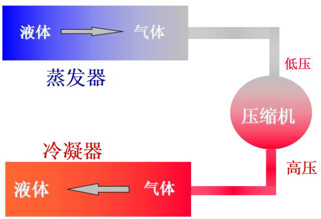 來(lái)自蒸發(fā)器的低溫低壓的冷媒氣體被壓縮機(jī)壓縮成高溫高壓的氣體進(jìn)入冷凝器
