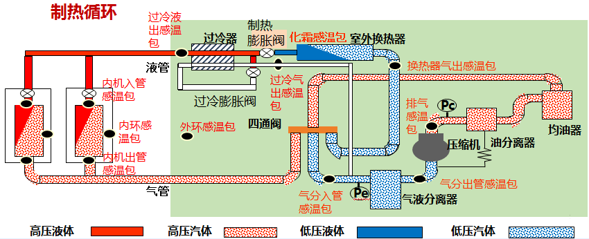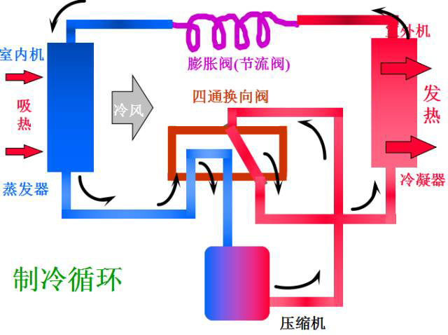 制熱原理與制冷原理基本相同,不同的是通過(guò)電路系統(tǒng)控制電磁四通閥中的閥塊進(jìn)行換向,從而改變制冷劑的流向,實(shí)現(xiàn)制冷到制熱功能的轉(zhuǎn)換。