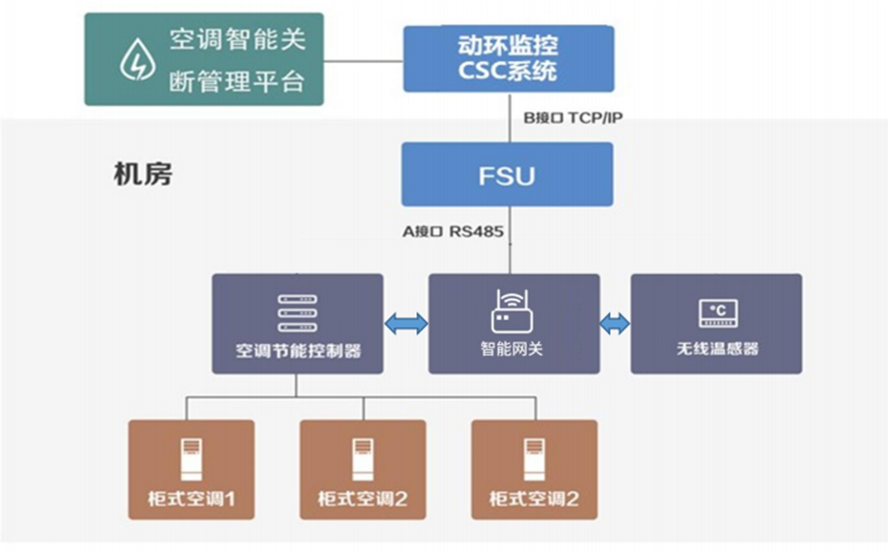 整系統(tǒng)由空調(diào)智能關(guān)斷管理平臺(tái)及部署在機(jī)房側(cè)的空調(diào)節(jié)能控制器、智能網(wǎng)關(guān)、無(wú)線溫度傳感器等組成; 平臺(tái)部署在內(nèi)網(wǎng)服務(wù)器,對(duì)接動(dòng)環(huán)監(jiān)控CSC系統(tǒng),通過(guò)動(dòng)環(huán)系統(tǒng)進(jìn)行帶內(nèi)傳輸?shù)姆绞脚c節(jié)能設(shè)備進(jìn)行通信,機(jī)房側(cè)的監(jiān)測(cè)及控制設(shè)備通過(guò)RS485進(jìn)行回傳數(shù)據(jù)至服務(wù)器,實(shí)現(xiàn)平臺(tái)對(duì)空調(diào)控制器等節(jié)能設(shè)備的監(jiān)測(cè)和控制,并按策略執(zhí)行空調(diào)節(jié)能控制